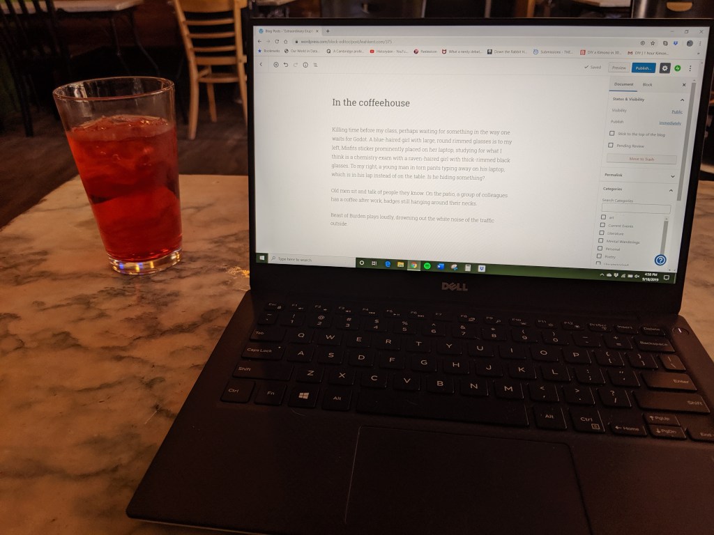 Killing time before my writing class, perhaps waiting for something in the way one waits for Godot. A blue-haired girl with large, round rimmed glasses is to my left, Misfits sticker prominently placed on her laptop, studying for what I think is a chemistry exam with a raven-haired girl with thick-rimmed black glasses. To my right, a young man in torn pants typing away on his laptop, which is in his lap instead of on the table. Is he hiding something?