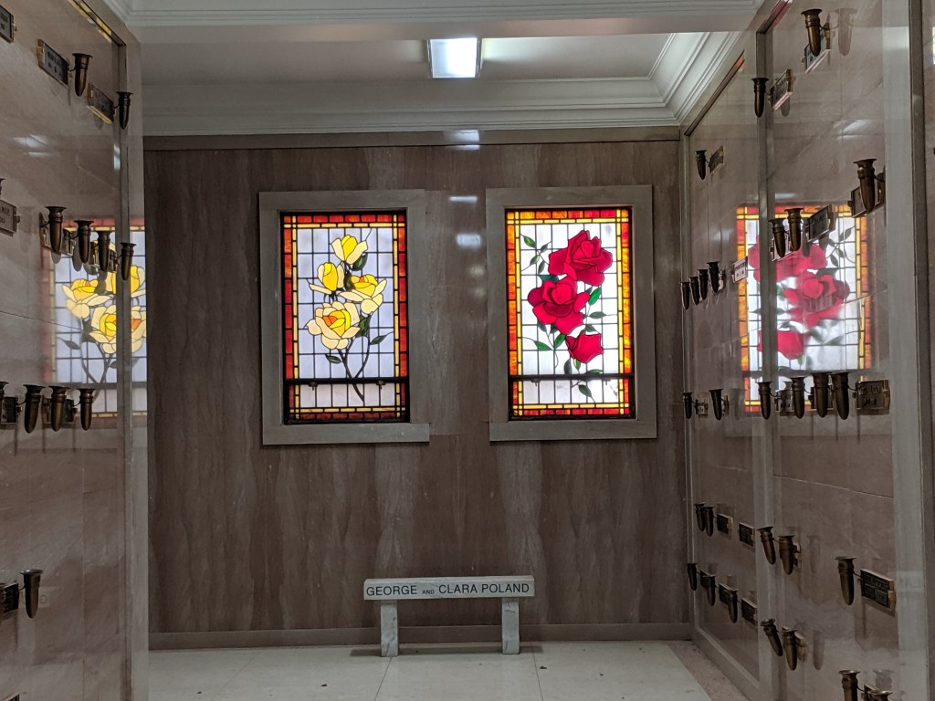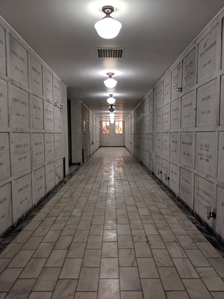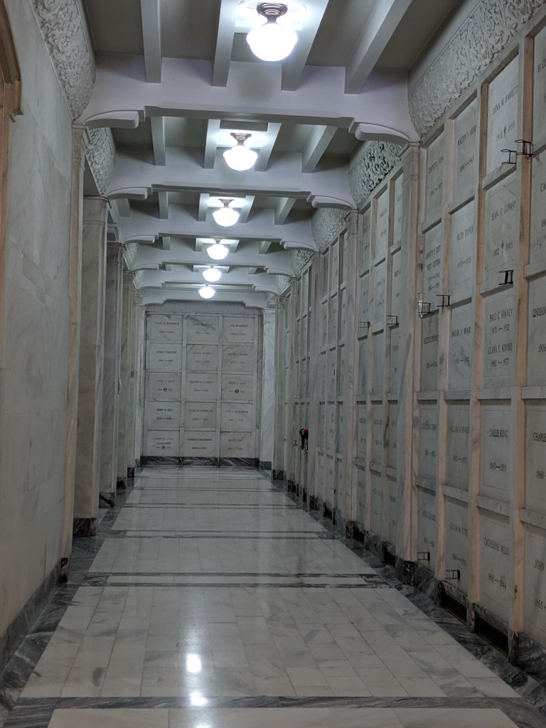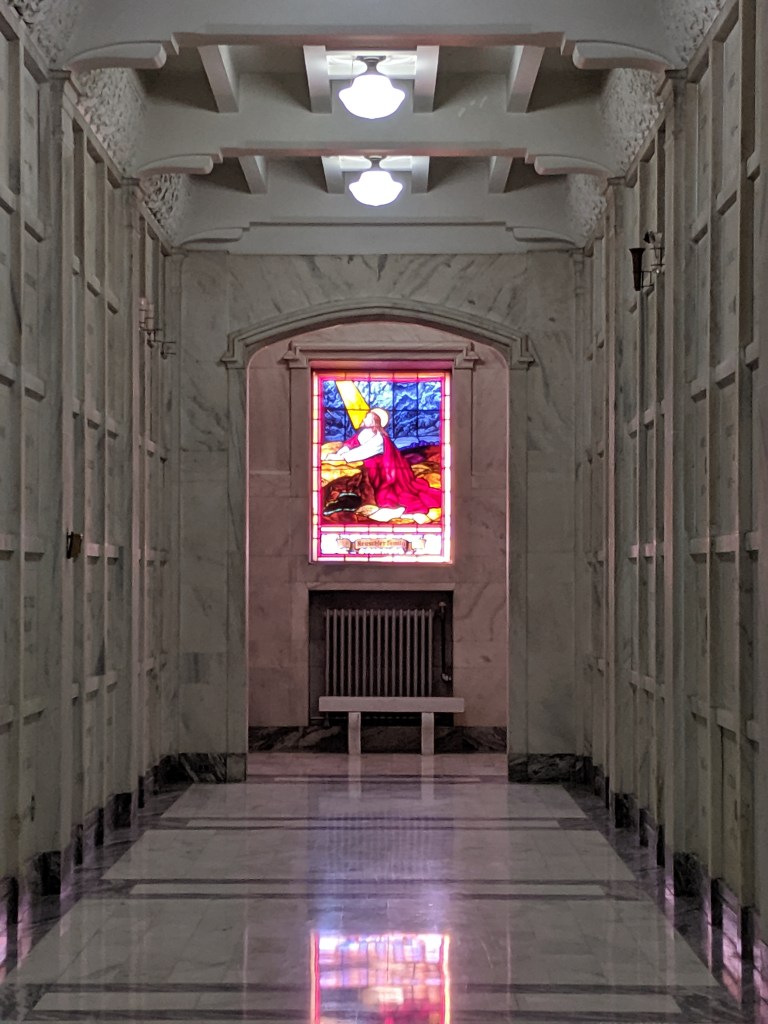 In reality, it’s a mausoleum, the final resting place of quite a lot of former people, some in large ornate rooms, others in spaces no larger than a drawer. Many of the areas are stark and pristine, white-gray stone, dim lighting – though some surprise you with little pops of color via stained glass windows.